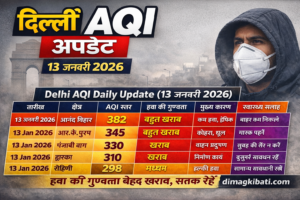 दिल्ली में बढ़ता प्रदूषण, AQI 360 से ऊपर, मास्क पहना व्यक्ति और धुंध में ढकी दिल्ली की सड़कें दिल्ली में वायु प्रदूषण खतरनाक स्तर पर, AQI 360+ पहुंचा – dimagkibati.comयह तस्वीर राजधानी दिल्ली में बढ़ते वायु प्रदूषण को दर्शाती है, जहां AQI 360 से ऊपर पहुंच चुका है। धुंध और स्मॉग के कारण दिल्ली की सड़कों और ऐतिहासिक इमारतों पर प्रदूषण की चादर नजर आ रही है। स्वास्थ्य विशेषज्ञों के अनुसार इस स्तर का प्रदूषण सांस और हृदय रोगियों के लिए बेहद खतरनाक है।